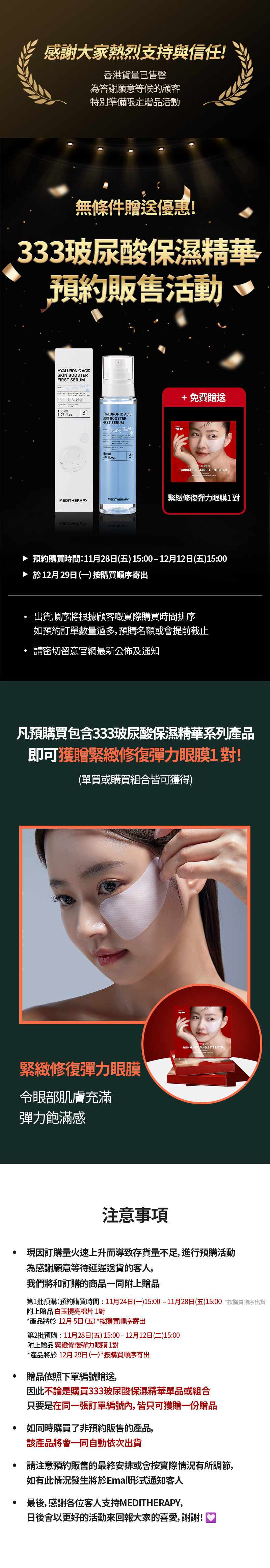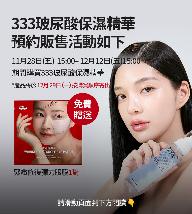 Until 2025-12-26T07:00:00.000+00:00 333玻尿酸保濕精華系列產品 預購送禮活動(緊緻修復面膜乙張) on selected products